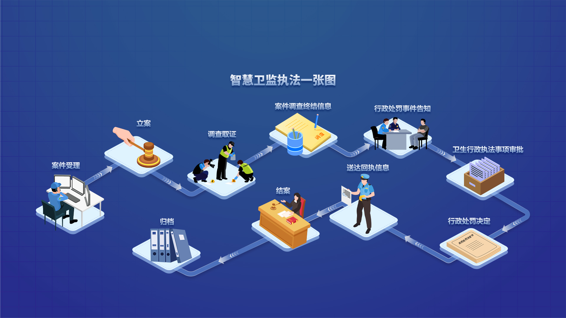 “智慧衛監綜合監管服務管理系統”涵蓋監督執法應用、非現場執法應用、碼上監管、可視化駕駛艙、信息交換系統等內容,實現加強衛生監督綜合執法能力建設,依法推進衛生監督工作,不斷創新衛生監督執法手段,提高衛生監督的監管和應急處置水平,通過建設智慧衛監系統,將傳統現場監管與非現場物聯網智能監督監測手段相結合,解決目前衛生監督機構無法及時掌握和處置突發狀況的問題,做到在第一時間獲取現場數據,在事件發生、升級前提前預警和處置,提高執法效率。